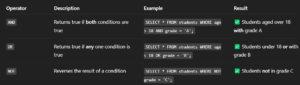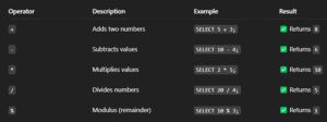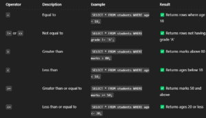 Used to compare values and return TRUE or FALSE. Commonly used in WHERE clauses. Examples: =, !=, >, <, >=, <=.