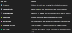 MySQL is used across industries by individuals, small businesses, startups, and large enterprises. Its flexibility, reliability, and open-source nature make it a favorite for many.