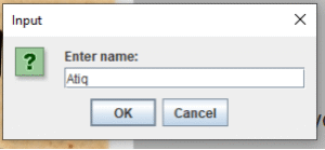 String name = JOptionPane.showInputDialog(b1, “Enter name: “);